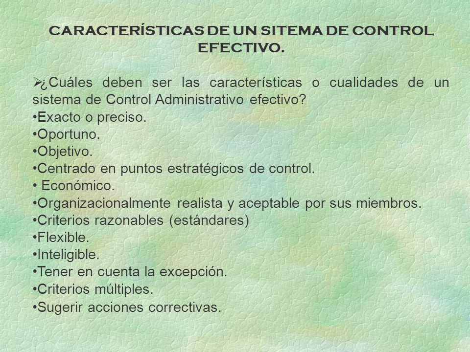 – Precisión: es confiable y da información válida. – Ocasión: crea los datos precisos en el tiempo. – Ahorro: justificado en concepto de valor y beneficio. – Elasticidad: se amoldan a cambios desfavorables o novedosas pretensiones. – Inteligibilidad: la información proporcionada es simple de agrandar. – Criterios razonables: son viables o alcanzables. – Colocación estratégica: administran los componentes estratégicos de la compañía. – Énfasis en la salvedad: los controles tienen la posibilidad de amoldarse a las condiciones aun si se desvían del estándar predeterminado. – Criterios múltiples: los criterios múltiples son estándares de medición que brindan una evaluación mucho más precisa del desempeño laboral.