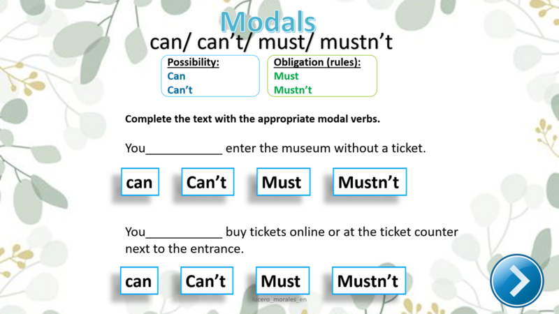 Tras leer una charla entre 2 personas que están comentando de proceder a un concierto, el alumno debe llenar los espacios en blanco en diez frases de la charla con el verbo modal preciso. Tienes que escoger entre 2 opciones que se muestran en la parte de abajo y clickear en 'siguiente' para revisar si la contestación es adecuada o no. Para guiarte, la traducción del artículo está libre en la parte de abajo de la pantalla.
